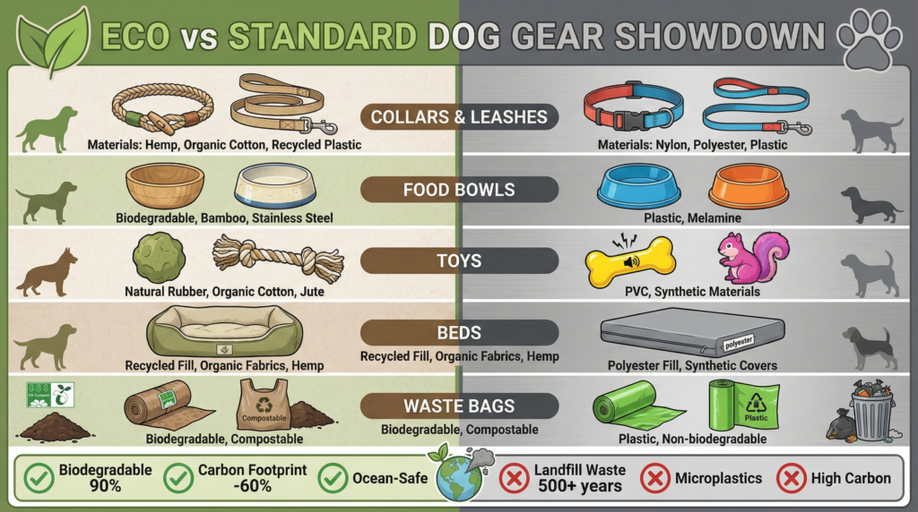 There’s more to it than just helping the planet. A lot of regular pet items are made with dangerous chemicals, man-made materials, and coloring that can harm your dog and you. Eco-friendly options usually use safe, natural materials that won’t hurt dogs who might chew or lick their gear. Also, green dog gear tends to last longer, so you won’t have to buy new stuff as often – this saves you money over time and cuts down on trash.