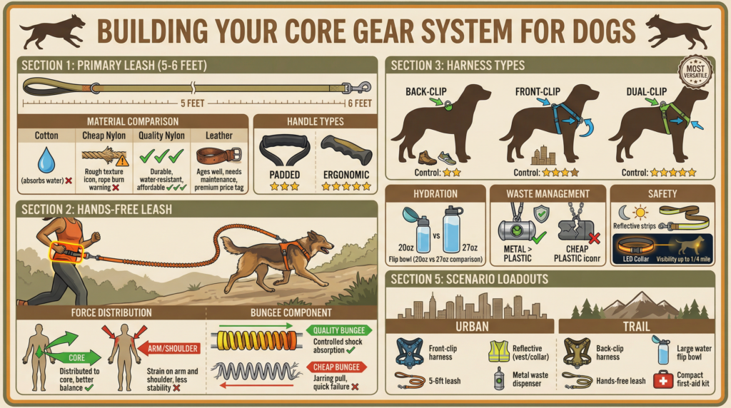 Start with foundation pieces, quality leash, properly fitted harness, and reliable water solution, before adding specialized equipment.